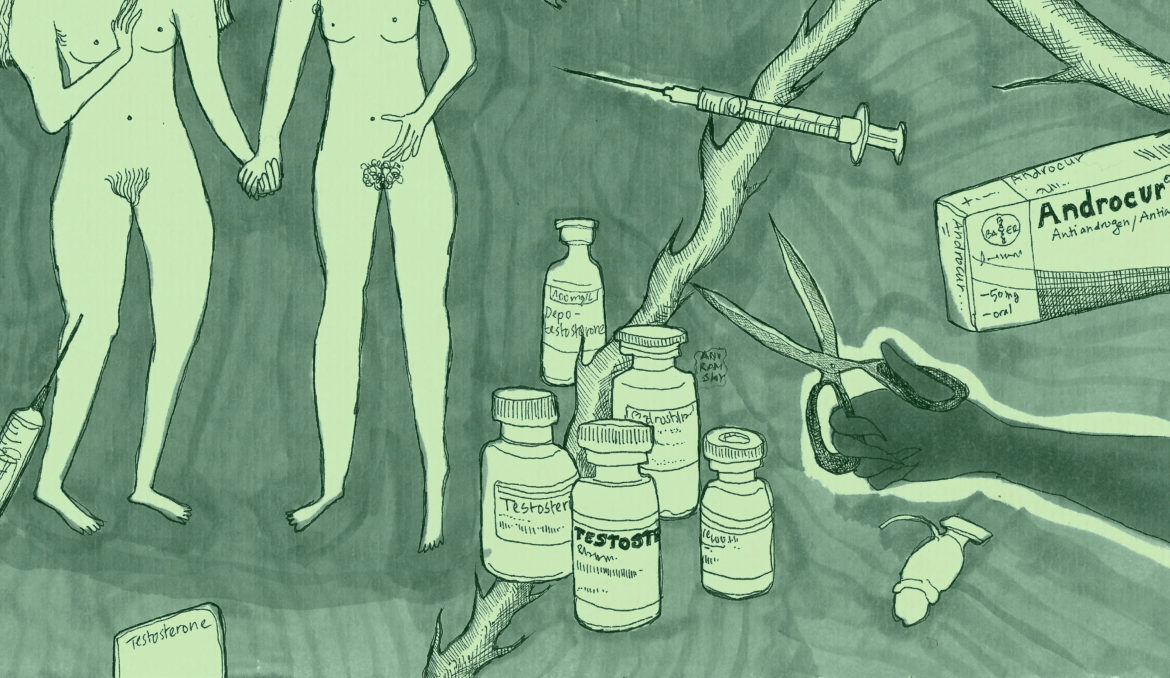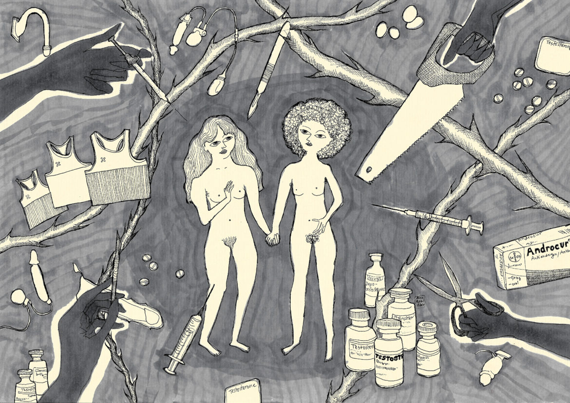 Au cours de l’année suivante, la patiente commence son parcours de transition médicale. La testostérone la rend plus sûre d’elle. Elle sourit plus. Sa chemise tombe élégamment sur ses épaules nouvellement musclées, d’autant plus après sa double mastectomie. La route est jalonnée d’étapes claires – elle et son / sa thérapeute parcourent ce chemin ensemble. Iels peuvent mesurer leur succès grâce aux poils de barbes et aux octaves obtenus vers le grave.